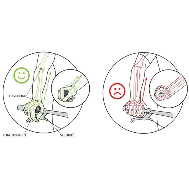 – Les poignées SPIRGRIPS® permettent à vos poignets de garder une position physiologique optimale, éliminant ainsi les douleurs articulaires et musculaires dues à une mauvaise position. Les freins et les sélecteurs de vitesses restent accessibles en tout temps.